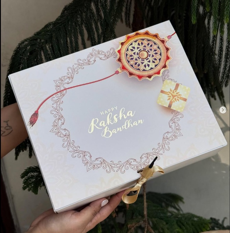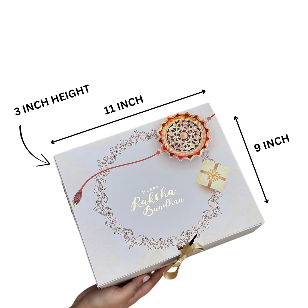 The sleek white tray with its festive Happy Rakshabandhan design brings a modern yet traditional vibe to your gifting. Sturdy, reusable, and stylish, it’s the perfect way to show your love and make your gift stand out.