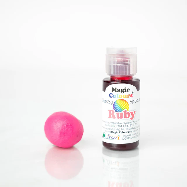 Infuse your confections with the luxurious richness of Magic Colours Ruby. This glycerine based , gel colour is ideal for use in cream, cake batter, fondant, sugar paste, flower paste etc. A favorite among professional chocolatiers and cake decorators for its intense pigment and consistent performance.