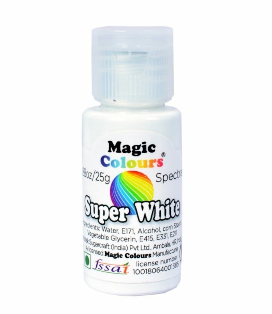 Add a warm, earthy richness to your edible creations with Magic Colours Super white . This glycerine based , gel colour is ideal for use in cream, cake batter, fondant, sugar paste, flower paste etc.The deep, chestnut brown tone is perfect intricate dessert details. Highly concentrated, this color delivers rich, vibrant results with minimal use, making it a favorite for professionals and home bakers alike.