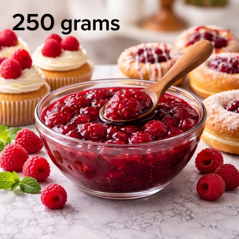 Delight in the rich, tangy sweetness of Raspberry Fruit Filling (250g) — the perfect companion for your homemade desserts. Crafted from juicy, ripe raspberries, this ready-to-use filling is ideal for layering in cakes, stuffing pastries, topping tarts, or adding a fruity finish to pancakes and waffles. Its bold berry flavor and smooth texture make every treat a little more special.