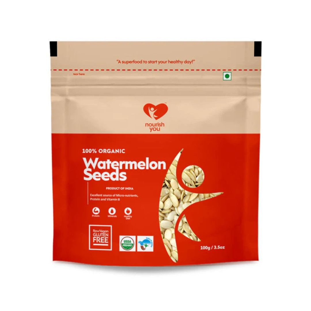 Nourish You Watermelon Seeds are nutrient-dense super seeds packed with plant-based protein, iron, magnesium, and good fats. This 100-gram pack contains raw, natural, and unprocessed seeds that support heart health, digestion, and skin wellness. Perfect for guilt-free snacking or as an addition to salads, smoothies, breakfast bowls, or baking recipes. Clean, vegan, and gluten-free—ideal for a healthy lifestyle.